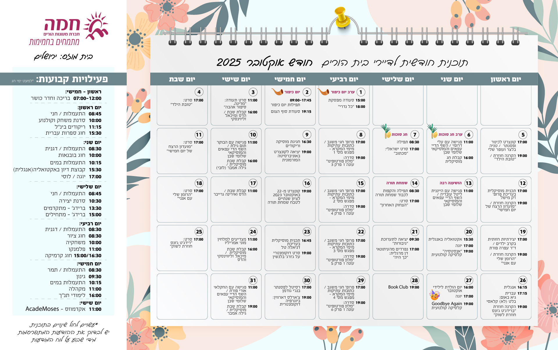 ייתכנו שנויים בתכניות החודשיות בבתים יש להתעדכן מול מנהל התרבות של בית ההורים.